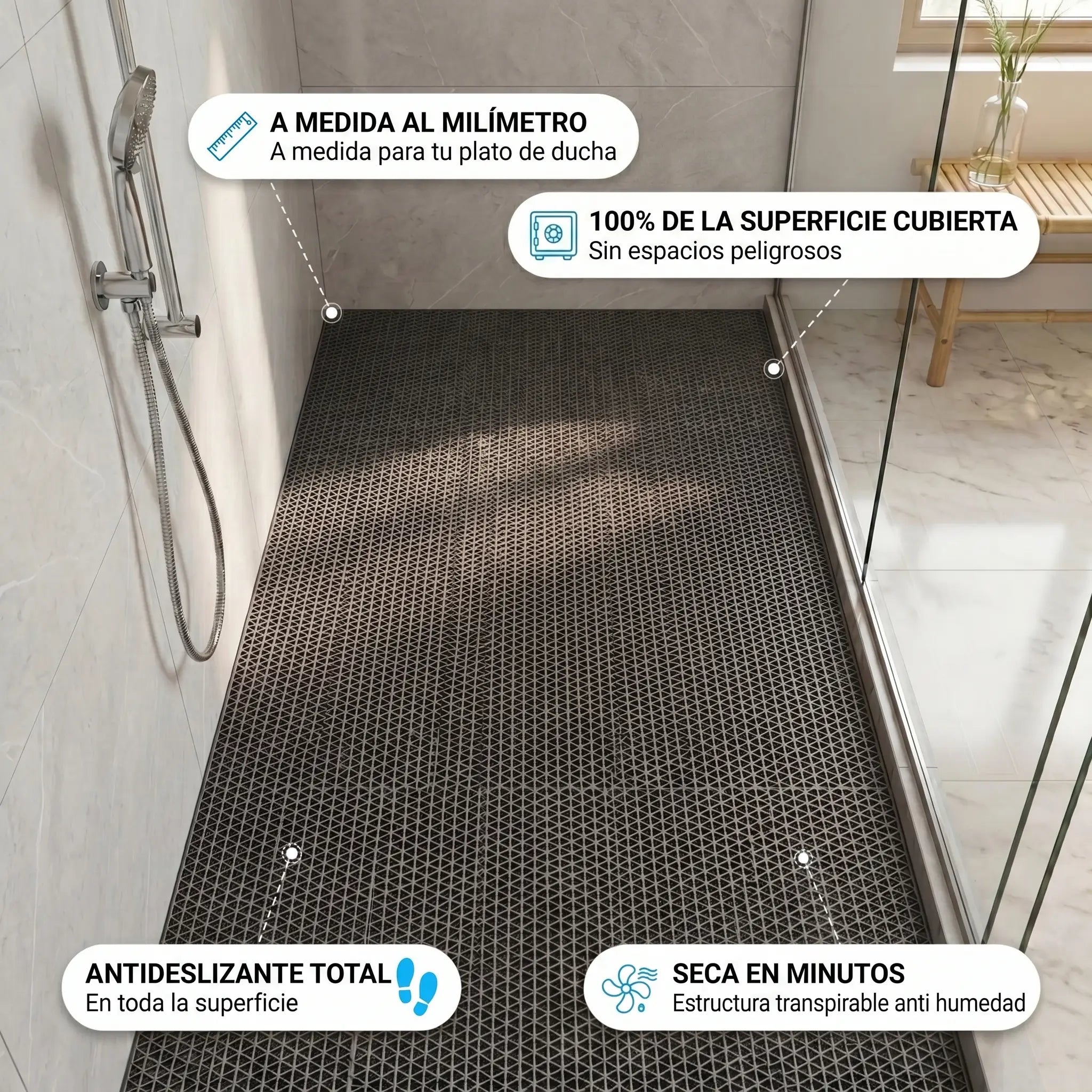 ¿Tu plato de ducha no encaja en los formatos estándar? ¿Tiene un cuarto de círculo, esquinas redondeadas, un desagüe descentrado o una base con dimensiones atípicas? La alfombra ducha antideslizante a medida se ha diseñado precisamente para estas situaciones. Cortada al centímetro, se ajusta a los bordes del plato, cubre las zonas de riesgo y se adapta a las limitaciones técnicas: umbrales, nichos, radios, canaleta, relieves.