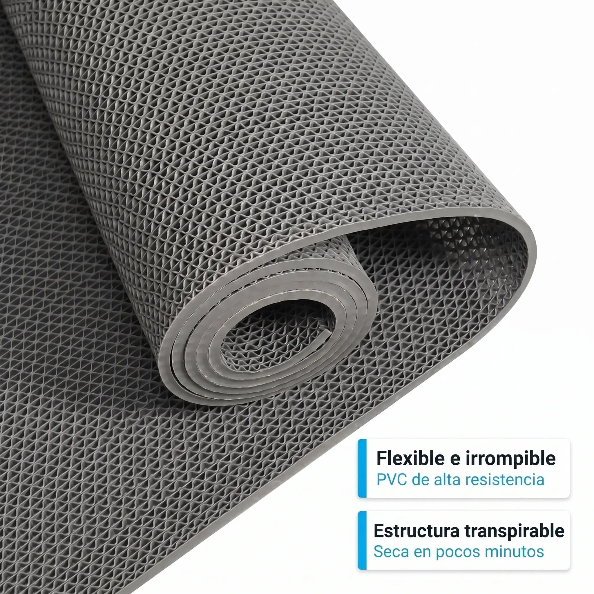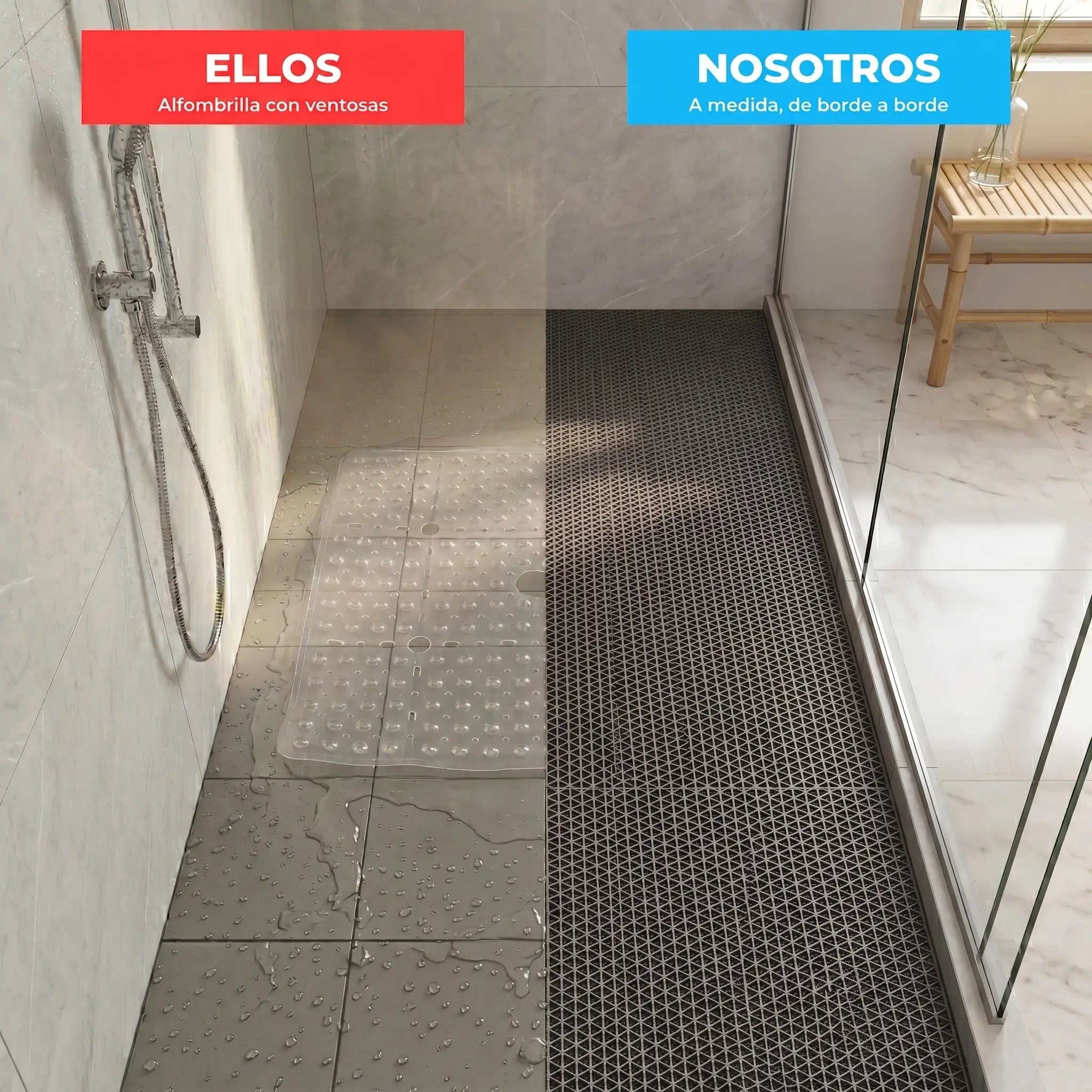 Las zonas sensibles, como la entrada de la ducha, las esquinas o el entorno del desagüe, permanecen protegidas. La alfombra reduce los puntos de giro inestables, evita los bordes levantados y hace más seguro el recorrido del usuario.